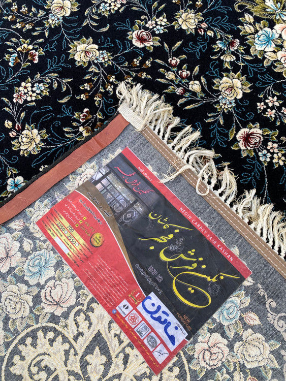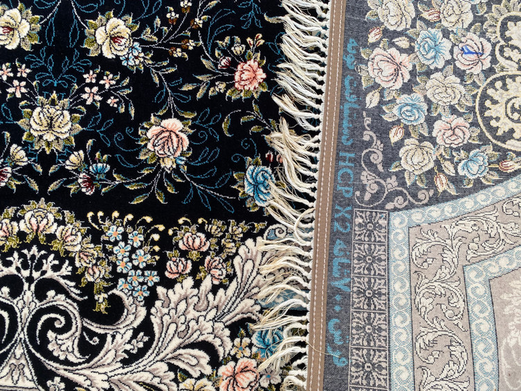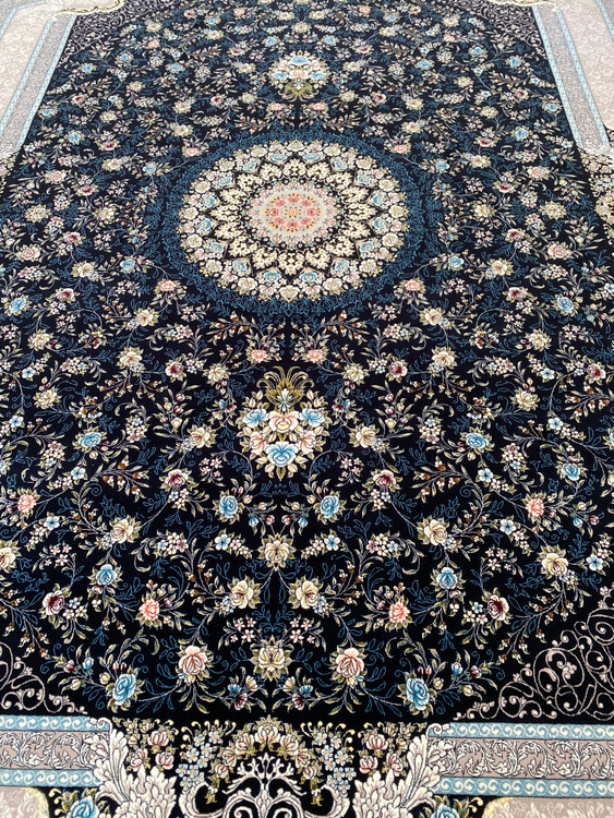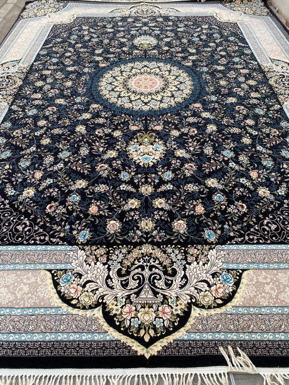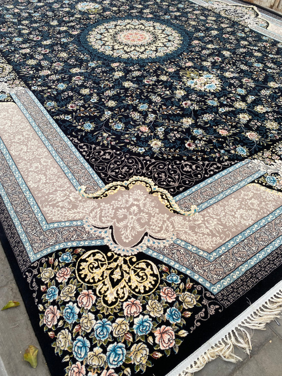 جفت فرش ۱۲متری ماشینی ۷۰۰ شانه در حد نو سرمه ای جنس صددرصد اکرلیک جنس درجه یک سالم و بدون هیچ عیبی هک شده روی فرش ۷۰۰ شانه خوابدار