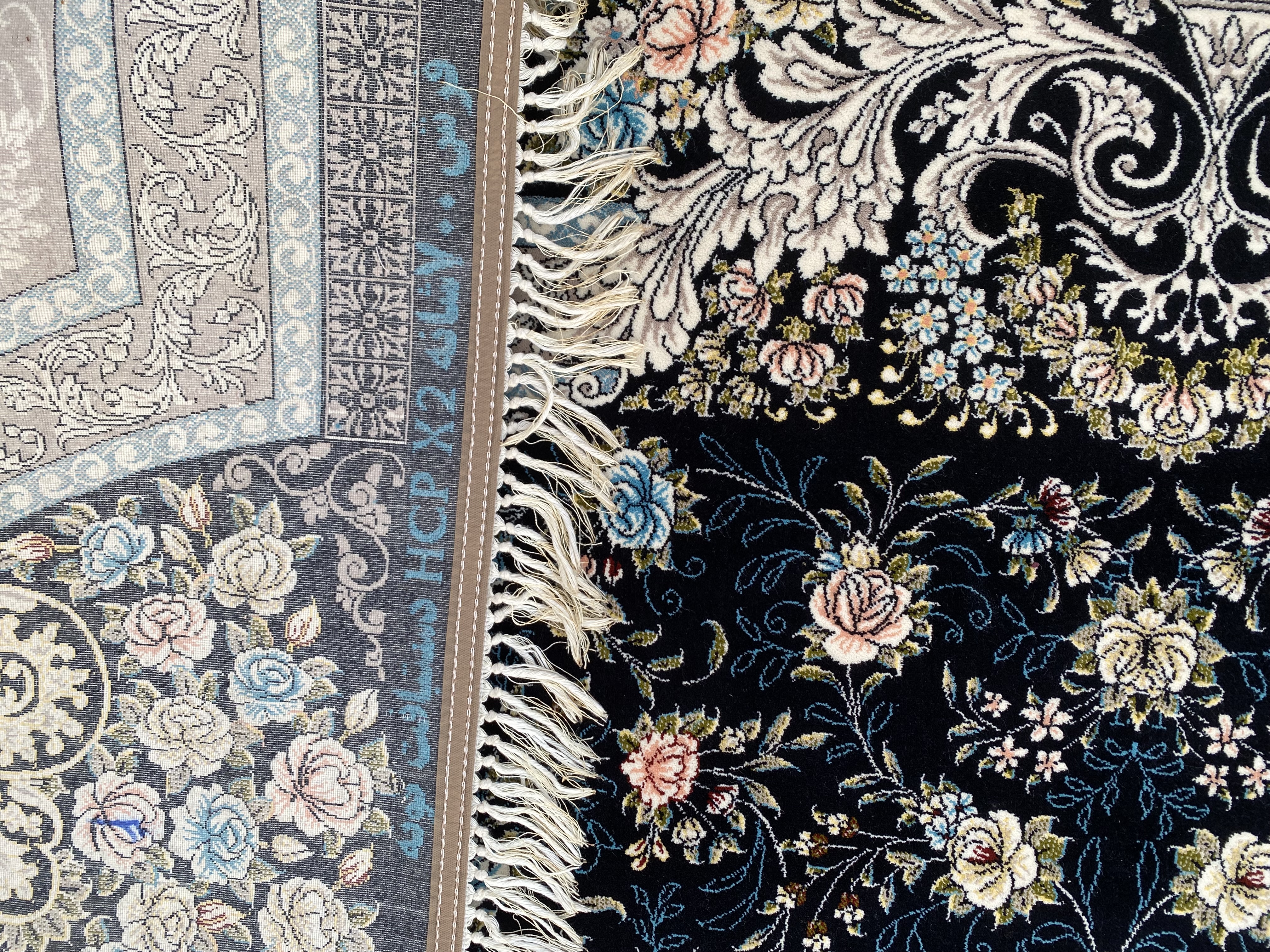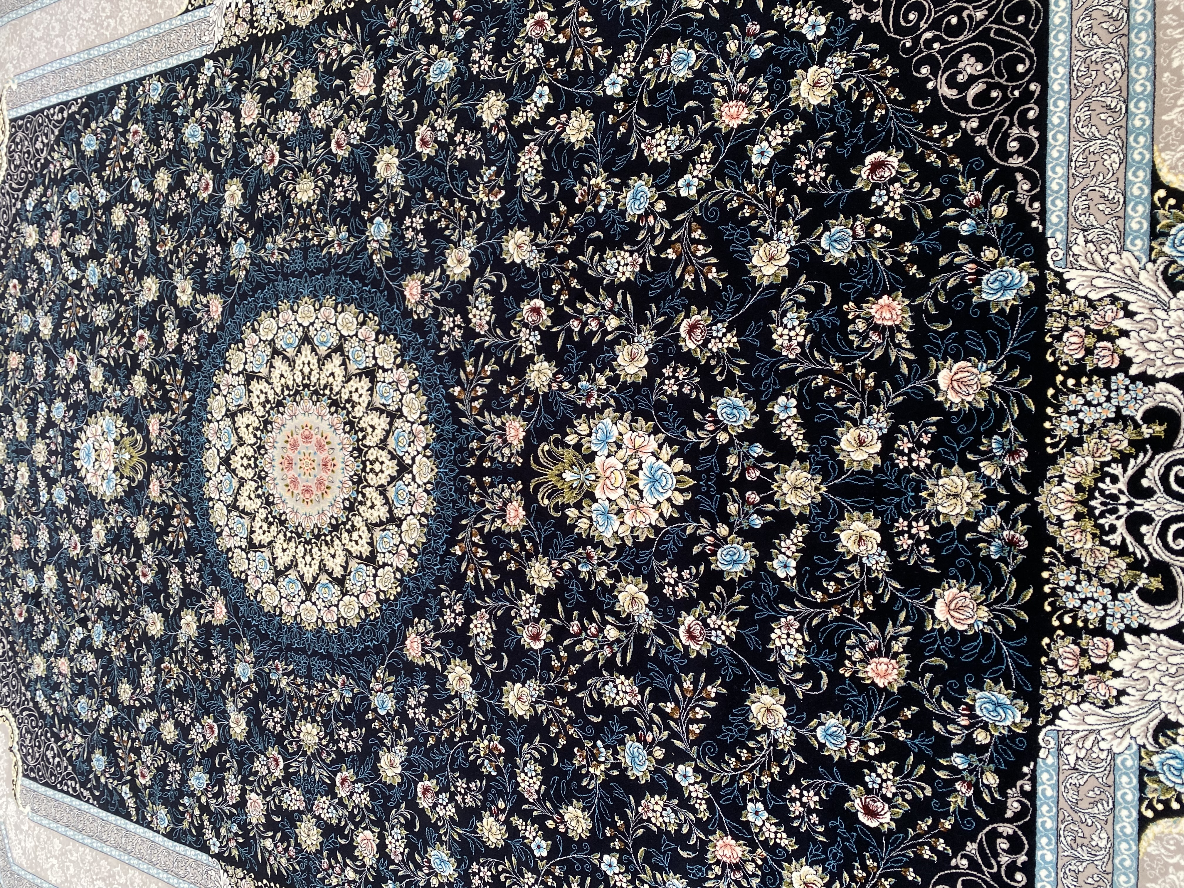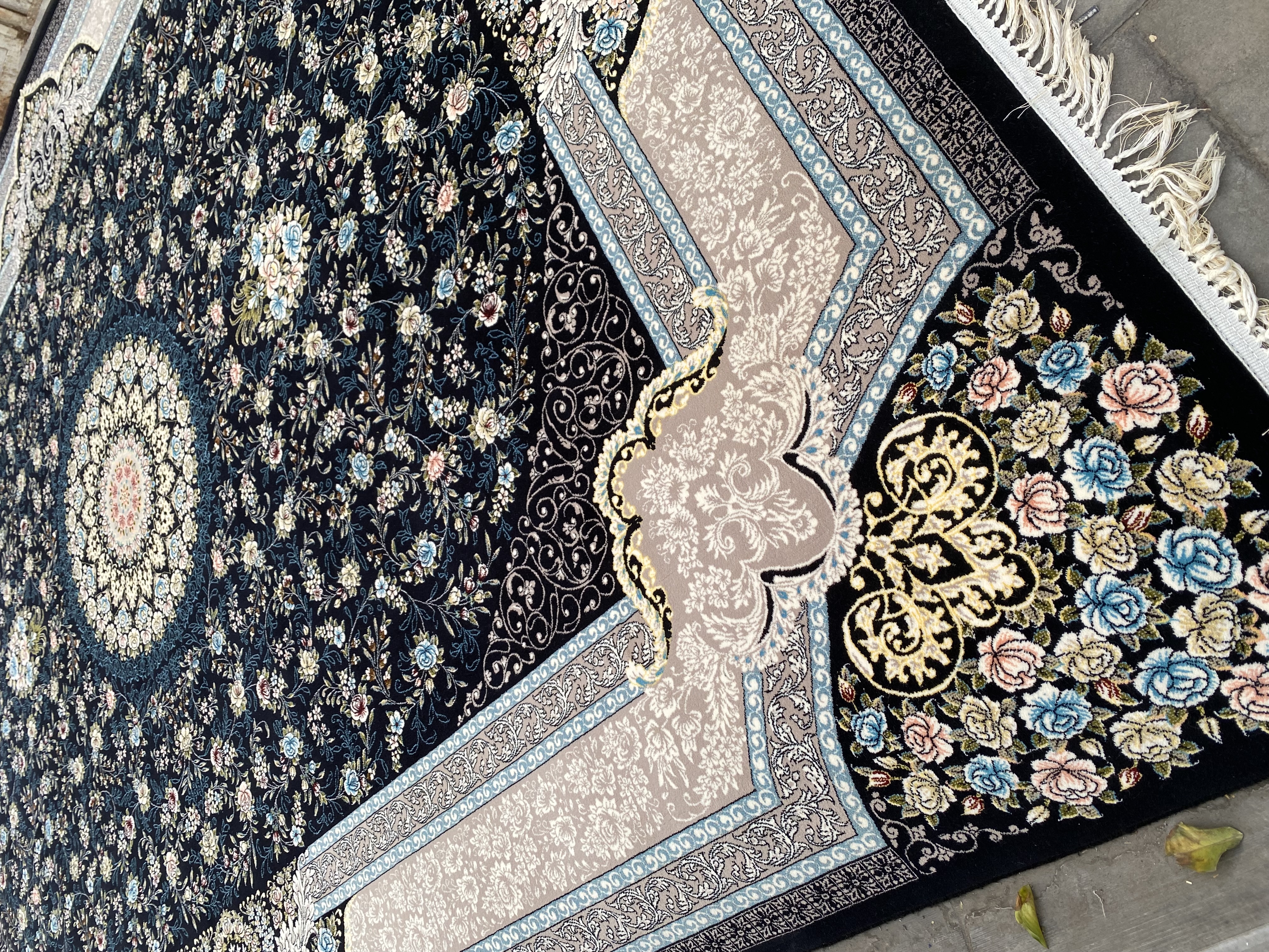 جفت فرش ۱۲متری ماشینی ۷۰۰ شانه در حد نو سرمه ای جنس صددرصد اکرلیک جنس درجه یک سالم و بدون هیچ عیبی هک شده روی فرش ۷۰۰ شانه خوابدار